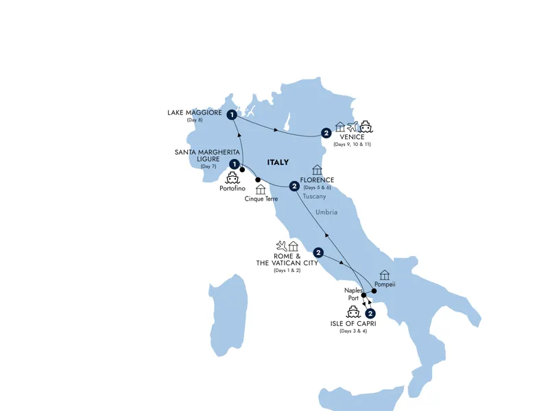 Want a deeper dive? Add the Amalfi Coast for sunshine, alluring turquoise waters, and cliffside lemon groves. Also, make sure to see to the beautiful Italian Lakes District and visit the five colorful cliffside villages of Cinque Terre to experience some of the most gorgeous scenery in Italy.