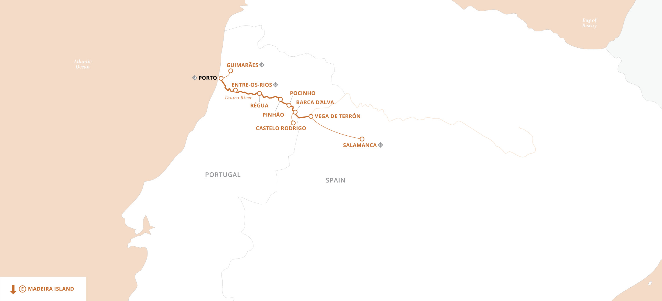 View All River CruisesAs you follow the Douro River through Portugal and into Spain, you’ll cruise past steeply terraced hillsides, quaint villages, and acres of ripe vineyards. Enjoy private tastings of Port. Explore Porto’s historic Ribeira district, home to iconic rabelo boats, cutting-edge cuisine, and a thriving art scene. Wind your way through the dramatic landscapes of the UNESCO-designated Douro Valley, heading ashore to visit charming quintas and meet the winemakers who operate them. See the famous university of Salamanca, Spain, and visit the mountaintop village of Castelo Rodrigo. There’s no better way to discover Europe’s best-kept secret than this scenic and all-inclusive river cruise!
