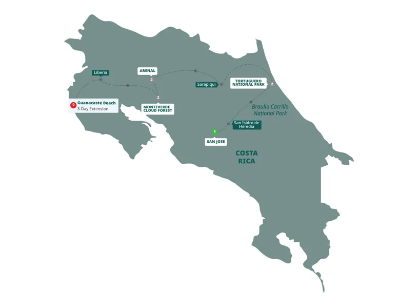 Glide through tree-lined waterways, relax in thermal pools, sample chocolate made from the world's best cacao and journey back in time with a native Quaker in Old Town Monteverde. Your Costa Rica tour captures the natural highlights of this biodiverse country including 3 days in Guanacaste.