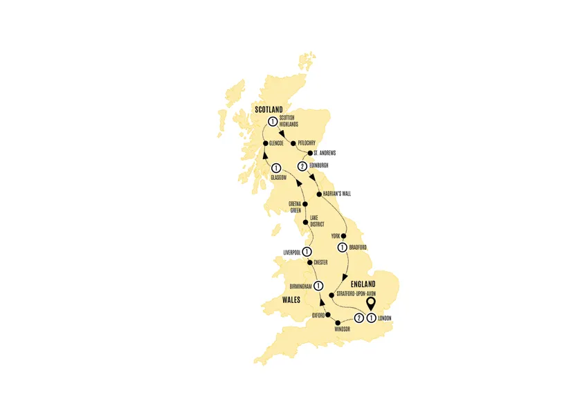 Delve deeper into the history and heritage of Britain, from Windsor Castle and Stratford-upon-Avon to the bonnie birthplace of kilts and clans. Let centuries-old architecture inspire you, fall in love with the beauty of the Lake District and engage with the best of Britain when you visit York, Edinburgh and Glasgow, topping it all off with a leisurely stroll in the footsteps of the golfing gods at St. Andrews.