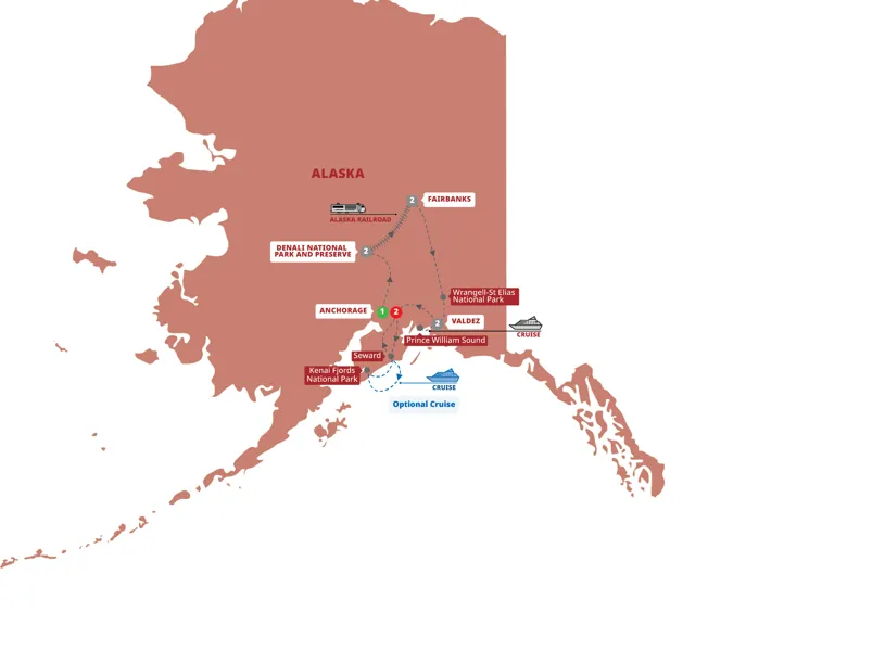 Anchorage, Denali National Park, Fairbanks, Valdez, Seward, Kenai Fjords National Park