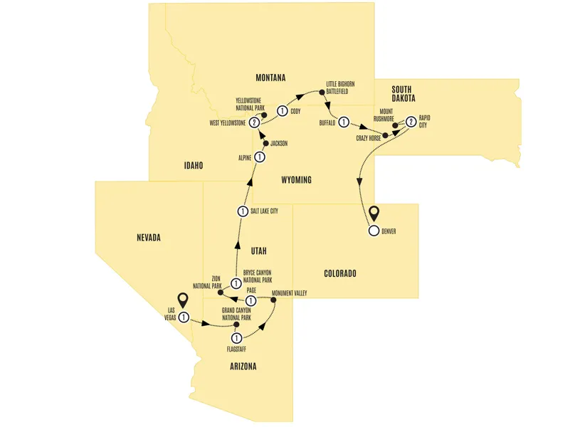 Las Vegas, Grand Canyon, Flagstaff, Monument Valley, Page, Zion National Park, Bryce Canyon National Park, Salt Lake City, Alpine, Jackson, Grand Teton National Park, West Yellowstone, Yellowstone National Park, Cody, Little Big Horn, Buffalo, Rapid City, Mt. Rushmore, Denver