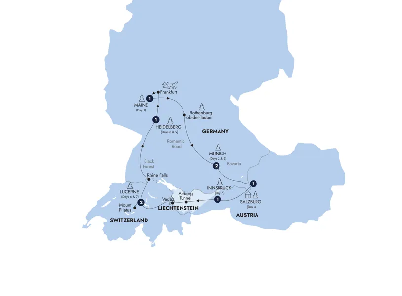 View all Christmas Market VacationsExperience the winter wonderlands of Europe like never before, beginning in Mainz, where Christmas markets and medieval streets open the festive season in style. Rothenburg ob der Tauber follows with an abundance of 16th-century charm, while in Munich, foaming steins of beer beckon at the city’s famous beer halls. Your journey continues in Salzburg with an exclusive market tasting, where locals serve mugs of Glühwein and freshly baked Lebkuchen, fragrant with ginger and spice. In Innsbruck, a horse-drawn carriage ride through the Alpine scenery and a visit to the world of Swarovski Crystal reveal another side of Austria, before stunning views over Lake Lucerne from the peak of Mt. Pilatus bring the journey to its close.